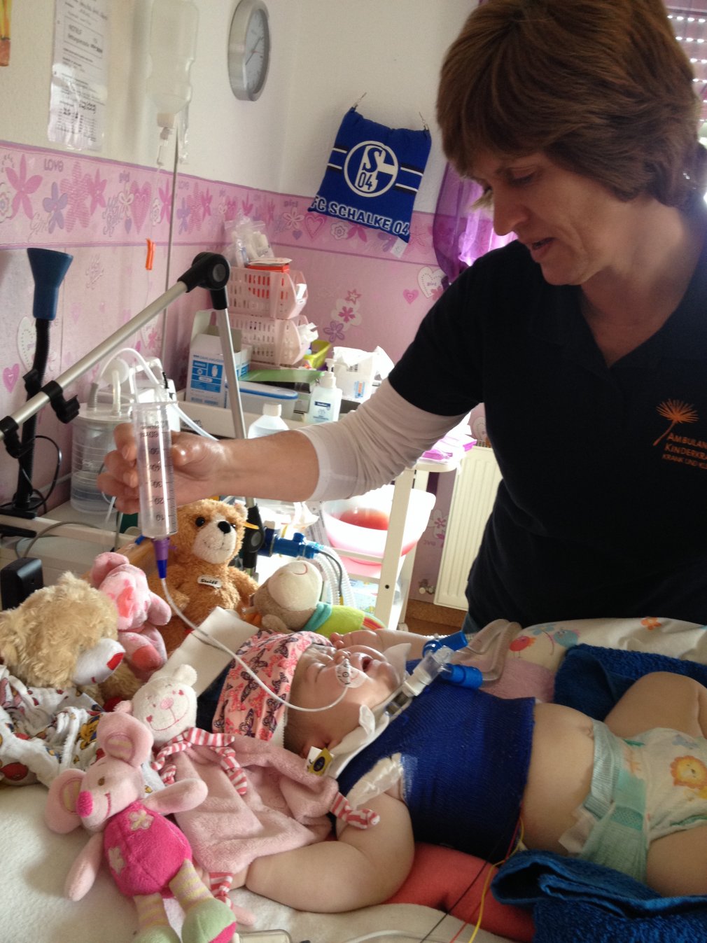 Das Team des ambulanten Dienstes versorgte im vorigen Jahr ingesamt 42 Kinder, fünf von ihnen mussten zu Hause beatmet werden. „Die Zeiten betrugen zwischen einer und 24 Stunden“, so Heike Witte. „Eine 24-Stunden-Versorgung ist jedesmal eine besondere Herausforderung. Denn man braucht dafür ein Team von acht Pflegekräften, die dann auch möglichst in der Nähe der Familie wohnen müssen, um die Fahrtzeiten gering zu halten. Und die Mitarbeiterinnen müssen zugleich oft auch spezielle Qualifikationen haben, sich mit den Eltern verstehen und von ihnen akzeptiert werden. Das ist manchmal nicht so einfach.“