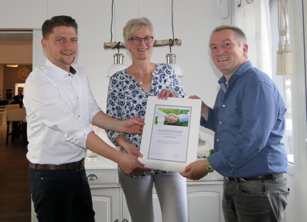 Bildunterschrift: Volker Wall (rechts) überreicht die Auszeichnung an Geschäftsführerin Heike Witte und Projektmanager Gabriel Stolze. (Foto: Meike Müller/ Krank und Klein)