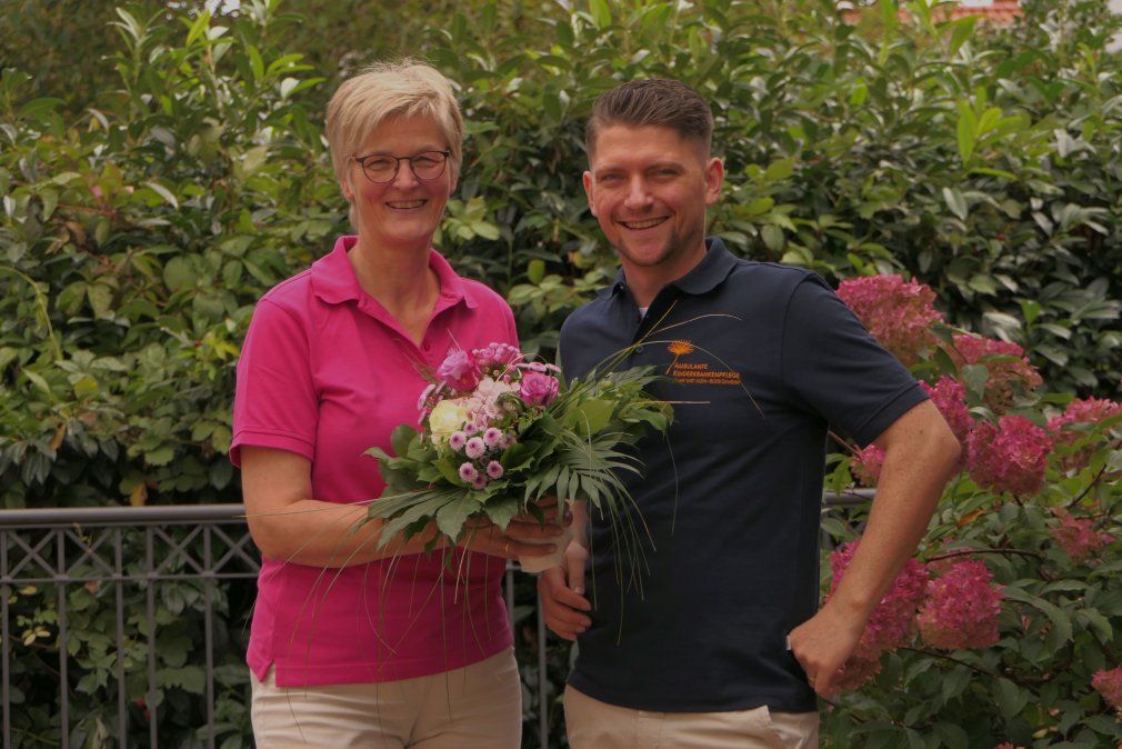Gabriel Stolze, Assistent der Geschäftsleitung, verabschiedet Annica Rönnspieß in die Rente.