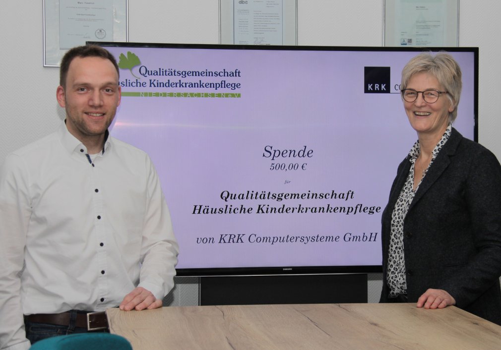 Unterstützung für Qualitätsgemeinschaft Mit einer Spende in Höhe von 500,- € unterstützt das Sulinger Unternehmen KRK Computersysteme die „Qualitätsgemeinschaft Häusliche Kinderkrankenpflege Niedersachsen“. Das Geld werde dringend für die Weiterbildung der Pflegefachkräfte in der Heimbeatmung der schwer erkrankten Kinder und Jugendlichen benötigt, sagte Heike Witte, Vorsitzende der Qualitätsgemeinschaft, bei der Übergabe in Sulingen. „Die Anforderungen der Krankenkassen sind im vorigen Jahr deutlich gestiegen. Daher müssen wir Mitgliedsdienste unsere #Pflegefachkräfte in Schulungen auf den neuesten Stand bringen“. Für die Unterstützung dankte sie KRK-Geschäftsführer Maik Bandolie sehr. Das Unternehmen hatte zu Weihnachten auf Geschenke an Kunden verzichtet und das Geld stattdessen gespendet. Die „Qualitätsgemeinschaft Häusliche Kinderkrankenpflege Niedersachsen“ ist ein Zusammenschluss aller #ambulanten #Kinderkrankenpflegedienste des Landes. Das Ziel ist es, Konzepte und Weiterbildungen für die optimale Versorgung schwerkranker Kinder und Jugendlichen zu Hause sicherzustellen oder auf den Weg zu bringen.